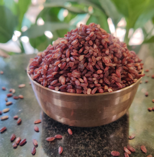 Bio Basics Kerala Matta (high bran) Rice is from a single PGS-certified organic farm in Palakkad. The bran content is around 70%  and may show slight variation from batch to batch because the rice is manually processed by adjusting the blade of the polisher. Since  most of the bran is left intact, the rice retains its deep red colour even after it is cooked.
