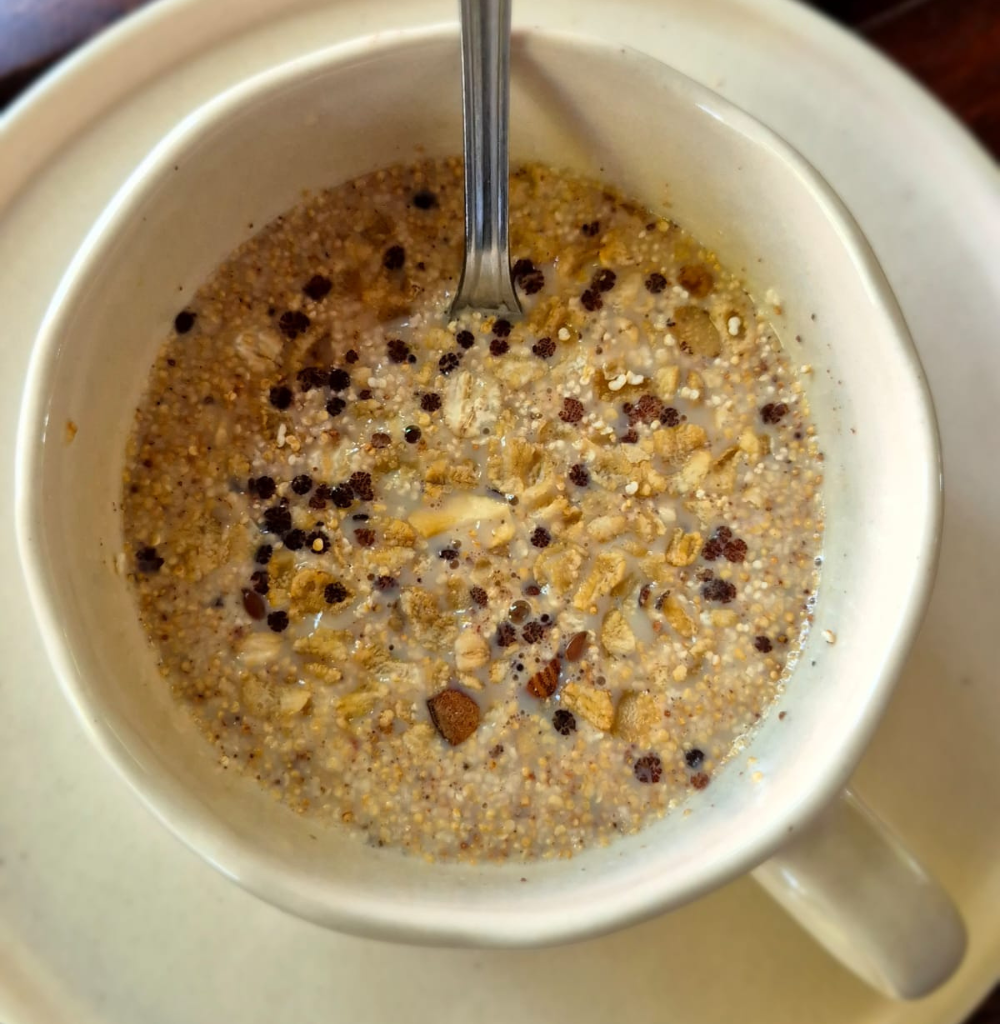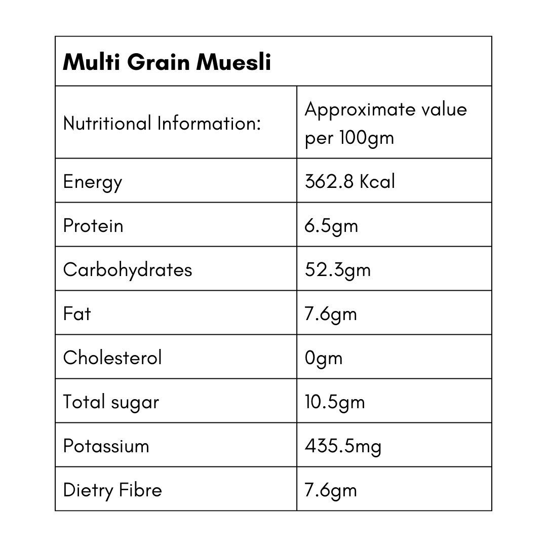 Multi Grain Muesli made with organic ingredients: A blend of organic wheat, barley & millet flakes, grains, nuts, seeds, and dried fruits. It's a crunchy, flavorful breakfast packed with nutrition. It contains gluten but has low GI, it offers sustained energy. Beyond taste, it embodies sustainability and mindfulness. Choose organic Multi Grain Muesli for a wholesome start to your day.