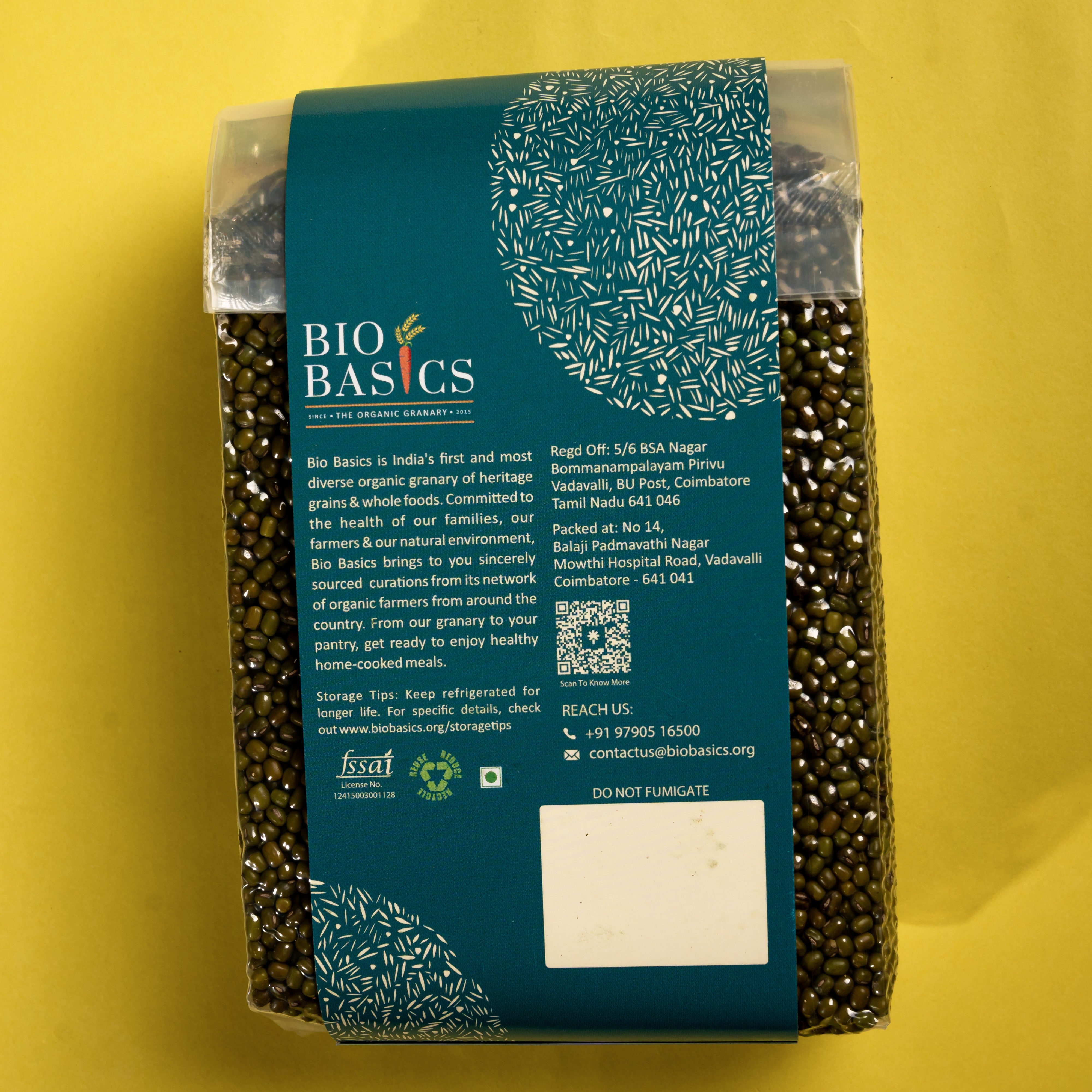 Moong Whole/Paasipayaru. Grown, processed and stored organically, Bio Basics Moong Whole comes from farmer groups in Tamil Nadu. Rich in Protein, Potassium, Magnesium and Fiber. Great for dals, payaru, soups, sundals etc.