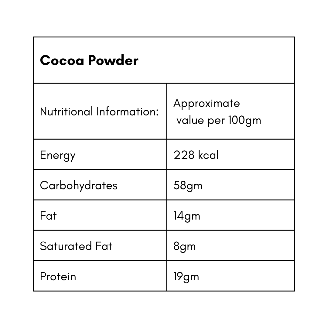 This non-alkalized, 100% cacao powder is made from organically grown cocoa near Annamalai. With minimal processing methods, without the use of any chemical processes - this cocoa powder contains antioxidants & nutrients. Enjoy the real taste of pure cacao, as it should be. Perfect for baking, hot chocolates & more!