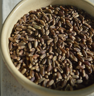 Black wheat looks black/purplish. This carries high amounts of anthocyanins and anti-oxidants. It is also high in dietary fiber and zinc. This is developed through normal plant breeding and is an improved variety. The original variety is from Japan and bred along with an Indian variety. Recently becoming popular in India, our black wheat comes from the organic farmer's group in Madhya Pradesh from where we source many of our wheat varieties. This becomes the eighth variety of wheat available to us.