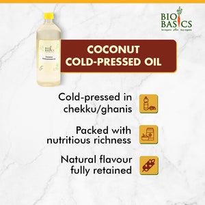 Bio Basic's Organic Coconut Cold Pressed Oil is a pure and natural oil made from organically grown coconuts. It retains all the goodness of coconuts due to the cold-press extraction method used. It is perfect for cooking and deep frying and is a staple in traditional Kerala cuisine. You can also use our organic cold pressed oil for skincare, haircare, oil pulling, and ulcer treatment.