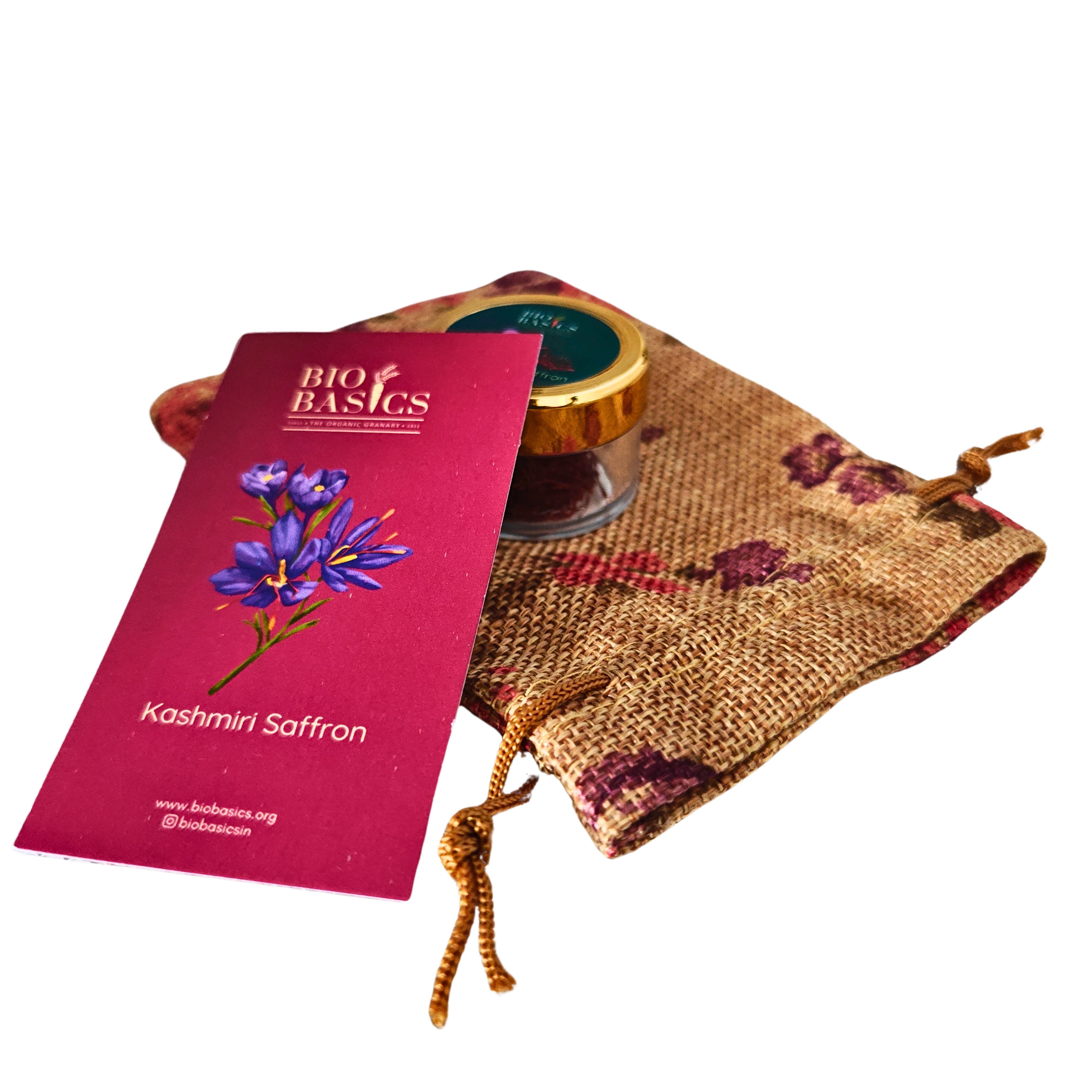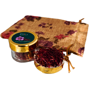 This delicious saffron comes in a tiny floral jute bag and a keepsake bookmark card about saffron and a cute Seasons greetings card .